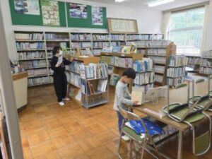 図書室の清掃です。通常はなかなかしませんが,今日は特別教室の清掃も行いました。五年生が本棚の上にある本を一年生に渡し,本棚の上を拭いている間に,一年生はその本を机の上に移動させていました。連係プレイです!五年生が優しく教えてくれます。