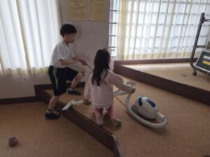音楽室です。四年生が掃除機の使い方を一年生に教えていました。でも一年生は使い方が上手でしたね。家でもやっているのでしょうか?