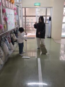少人数の小菅小の清掃は,全校が縦割り班になり行っています。ここでは,三年生が一年生に教えています。